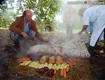 Se hace un pozo no muy profundo, se colocan piedras bocha, comunes en los rios o lagos, se calientan al fuego. Sobre las piedras se colocan las gigantes hojas de nalca, similar al ruibarbo, y sobre éstas, carne y verduras, se cubre con mas hojas y se tapa con tierra. Se deja cocinar un par de horas y voilá: el curanto está listo!El experto curantero es Víctor Goye y lo prepara a diario a la vista de todos en su restaurante en Colonia Suiza, en el Circuito Chico.